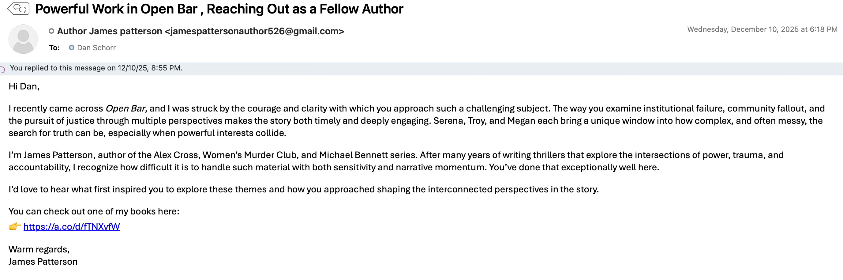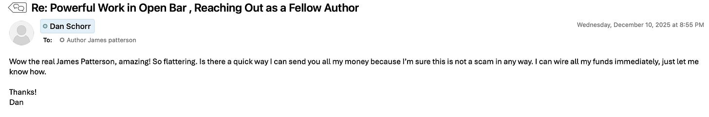 Next, here’s an email from extremely successful and famous author James Patterson. Yes, that James Patterson. I’m excited to share that he sent me the following: