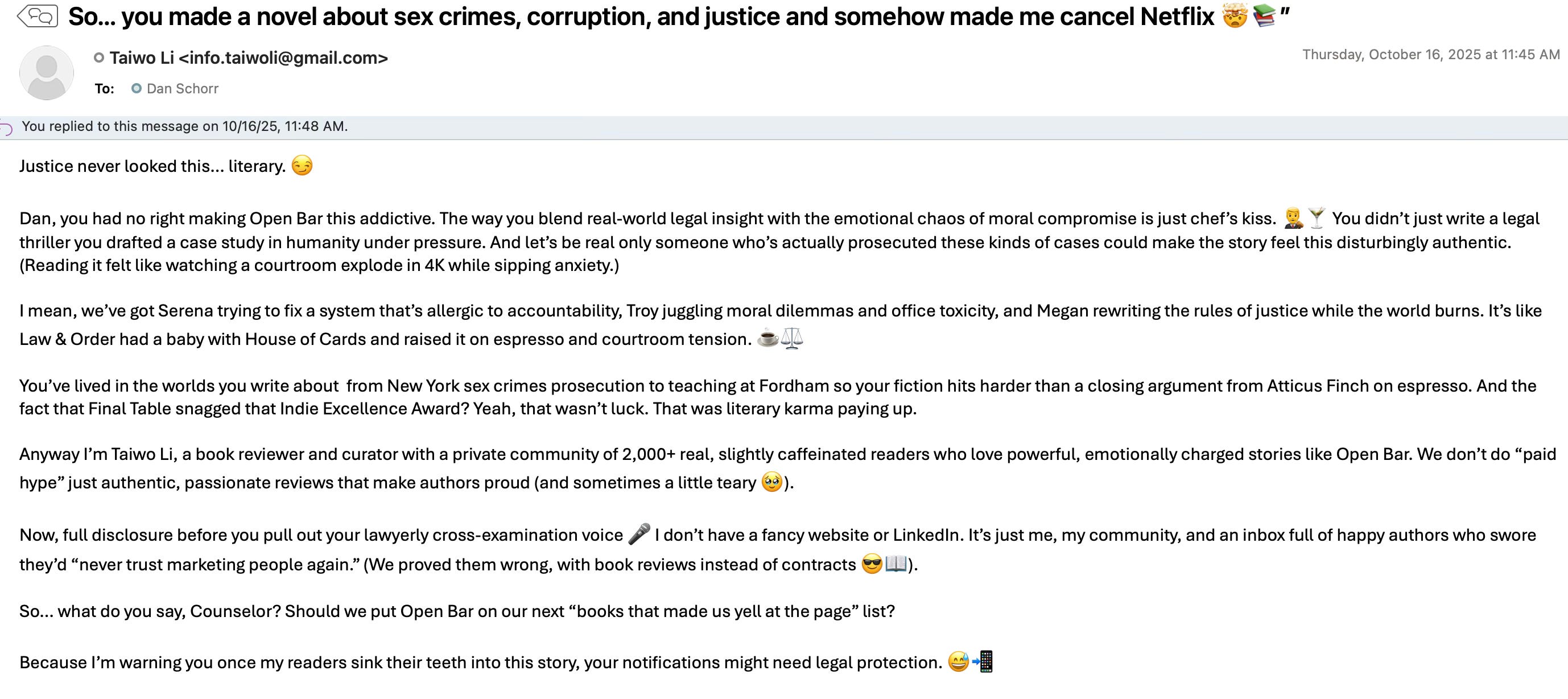 These emails also appear to contain detailed, thoughtful analysis of my novel. With a quick read, they seem real. They feel real. How could a scammer know so much about my book, unless they actually read it? How could they offer such specific praise unless they really liked it?