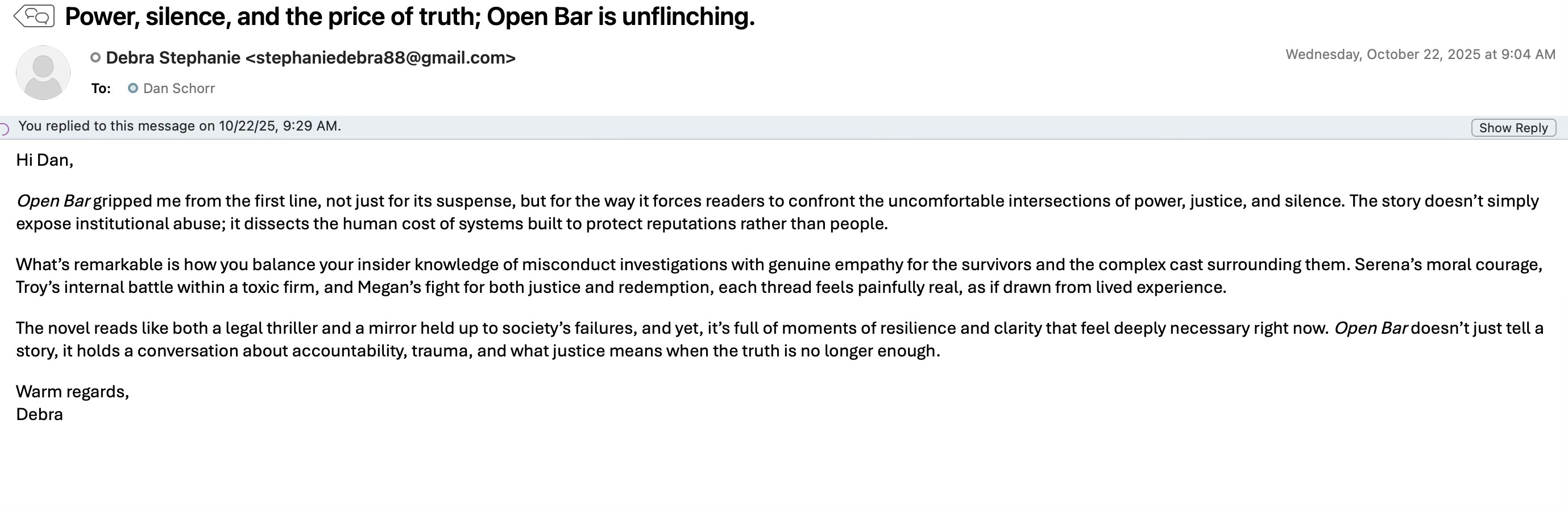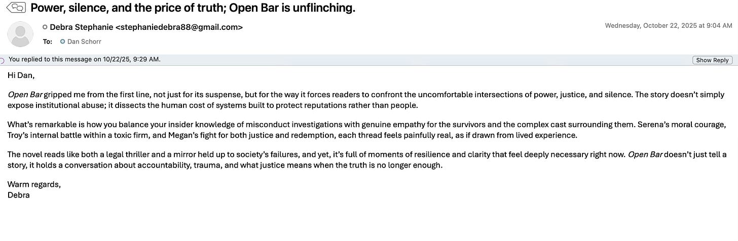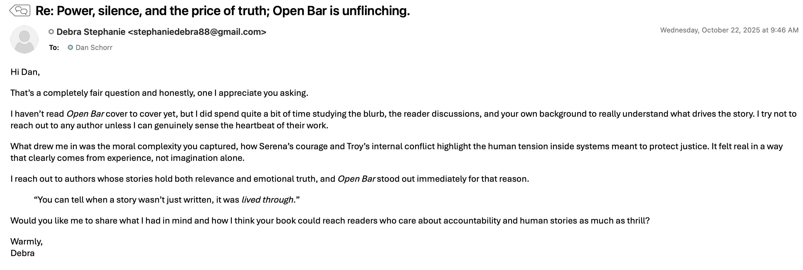 I knew “Debra Stephanie” was another AI-drafted email looking to take advantage of authors craving effective publicity. Nevertheless, because the (AI-generated) intro said, “Open Bar gripped me from the first line,” I wrote back simply, “Have you actually read the book?”